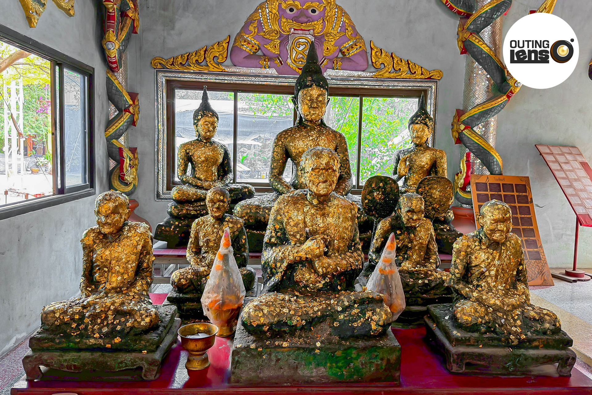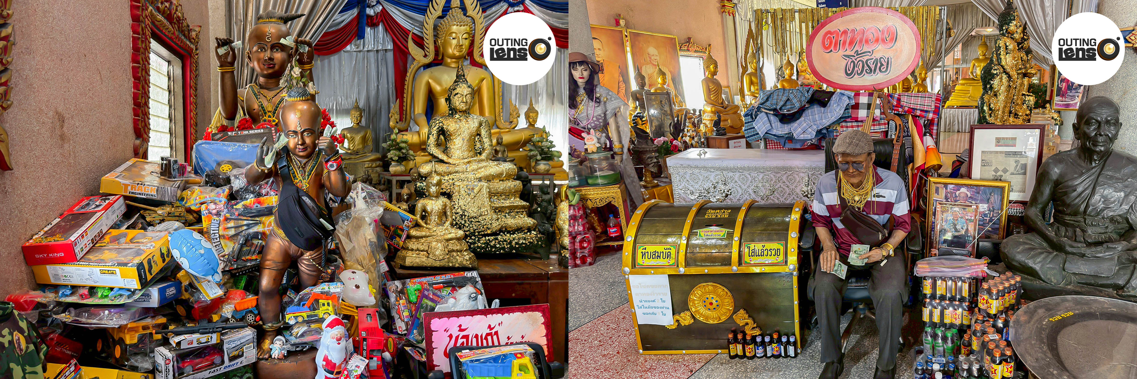 หลังจากไหว้พระประทานแล้ว อย่าลืมแวะไปขอพรกับ “กุมารทองน้องเก้า” อีกหนึ่งจุดศรัทธาที่ได้รับความนิยมไม่แพ้กัน(คนมาขอหวยเพียบ) ส่วนใครที่หวังเรื่องโชคลาภ เลขเด็ด ต้องไปขอพรกับ “ตาทองงิ้วราย” โดยสามารถนำเลขจากธนบัตรที่ได้ไปเสี่ยงโชค เผื่อจะได้รับโชคก้อนโตกลับบ้าน (ตาทองงิ้วรายประวัติก็ไม่ธรรมดา)