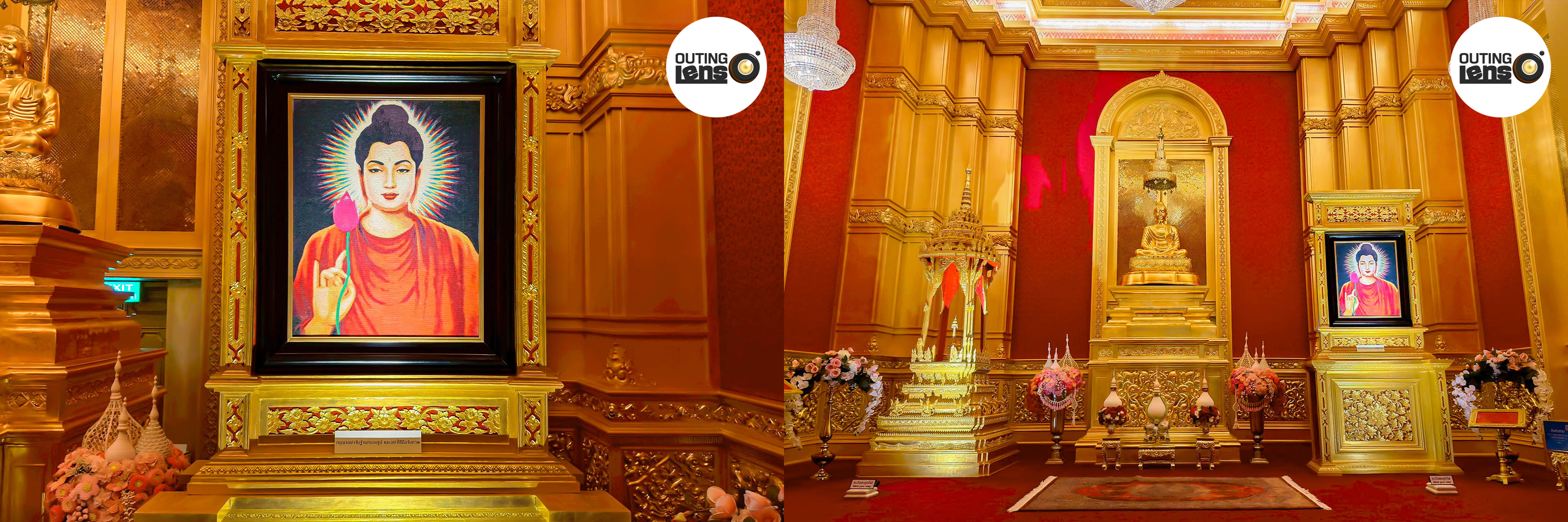 เมื่อเดินเข้าสู่โถงกลางด้านใน จะเจอกับ “พระพุทธรูปประดับทอง” ประดิษฐานอย่างสง่างาม พร้อม “พระบรมสารีริกธาตุ” และงานปักรูปเหมือนพระพุทธเจ้าอันทรงคุณค่า ซึ่งช่างผู้ปักจะตั้งจิตอธิษฐานคำว่า “นิพพาน” ทุกฝีเข็ม งานศิลป์ชิ้นนี้จึงไม่เพียงงดงาม แต่ยังเปี่ยมไปด้วยพลังแห่งศรัทธา (ของจริงสวยมาก)